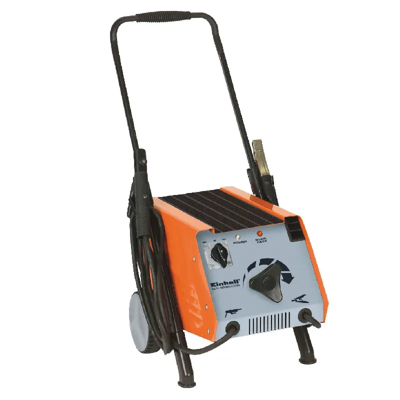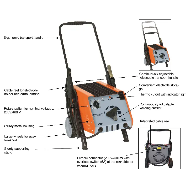 Electric welding transformers are used primarily for weld-joining flat irons, angle irons, tubes, or similar materials. One great advantage of electric welding is that it obviates the need for warming the materials, i.e. welding can be started directly at the requested position. Work-pieces of various strengths can also be welded to each other with equal ease. The electric welding transformer can be operated at 230V/400V nominal voltage. Nominal voltage is regulated with a rotary switch. The electric welding transformer is particularly suitable for mobile applications.